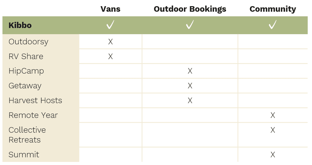 It’s difficult to conduct a direct competitive analysis since Kibbo offers something so unique. There are plenty of camper van startups, such as Outdoorsy, which has raised $75 million for its van rental marketplace, and Camper Cartel, which provide a luxury van life experience. And the co-living industry, which features popular startups Common Living, Starcity and Bungalow, is poised to make a comeback once the pandemic is over.